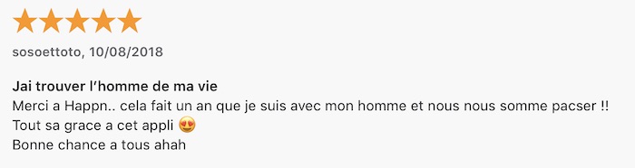 Pour ce deuxième avis, Sosoettoto a noté l’application de 5 étoiles sur 5. Dans son témoignage, elle remercie Happn car grâce à cette application, elle a trouvé l’amour de sa vie et elle s’est pacsée. Un témoignage qui donne de l’espoir à tous les célibataires inscrits.