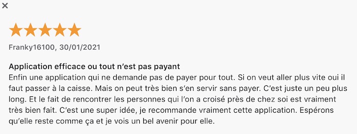 Dans ce premier témoignage d’utilisateur, on retrouve Franky16100 qui apprécie le fait que l’on peut très bien utiliser l’application sans payer un abonnement. Forcément, certaines fonctionnalités ou avantages ne seront pas disponibles. Il aime le concept de rencontrer des personnes qui ont côtoyées les mêmes endroits que soi. Il recommande vivement l’application.